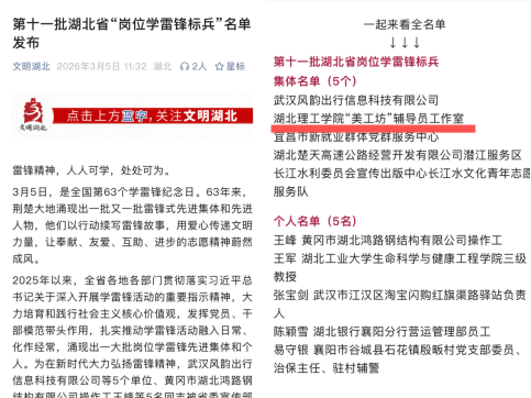 本网消息 3月5日,在第63个学雷锋纪念日到来之际,中共湖北省委宣传部公布第十一批湖北省岗位学雷锋标兵名单,艺术学院“美工坊”辅导员工作室等5家单位被命名为“第十批湖北省岗位学雷锋标兵”(集体),是全省高校唯一入选集体。
