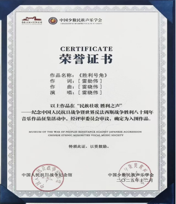 此次征集活动由中国人民抗日战争纪念馆与中国少数民族声乐学会(文旅部全国5A级学术团体)联合主办,通知由中华人民共和国国务院新闻办公室发布,汇聚全国顶尖音乐力量,是一场极具影响力的国家级文艺作品征集活动。《胜利号角》由艺术学院副院长雷晓伟作曲并演唱,艺术学院实习实训基地——黄石市风云文化传媒有限公司艺术总监雷勋伟作词,一经发布便获湖北日报、学习强国、黄石市广播电视台、黄石日报等新闻媒体广泛传播。