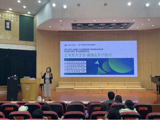 为满足学生多元需求,邀请湖北省艺术教育协会音乐教育分会常务副会长韩学晨举办专题讲座。就业板块解读企业用人标准与面试技巧,升学板块详解考研、留学的报考流程、院校选择与备考重点,分享成功案例。讲座兼具行业高度与实操性,现场互动热烈,有效解决学生“信息差”与“认知盲”问题。