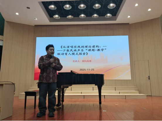 本网消息 11月25日,中央民大学博士、博士后吴涛(吴扎拉涛)教授在艺术学院演艺厅以《从演唱实践到理论建构:——少数民族声乐‘课题——教学’联动育人模式探索》为题,为学院师生带了一场兼具理论深度与实践指导意义的讲学活动。艺术学院副院长雷晓伟、音乐系主任韩雪静及150余名音乐系师生聆听了讲学。