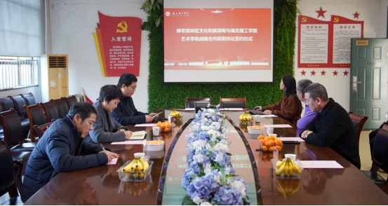 本网消息 12月6日下午,湖北理工学院艺术学院与神农架林区文化和旅游局战略合作框架协议签约仪式在艺术学院会议室举行。神农架林区文化和旅游局党组书记、局长卢琳,林区生态环境局党组书记、局长陈奎;湖北理工学院艺术学院院长刘满中,副院长汪超顺、雷晓伟,及艺术学院教师与校友代表共同出席活动。签约仪式由艺术学院在神农架林区文化和旅游局挂职的教师燕林飞主持。